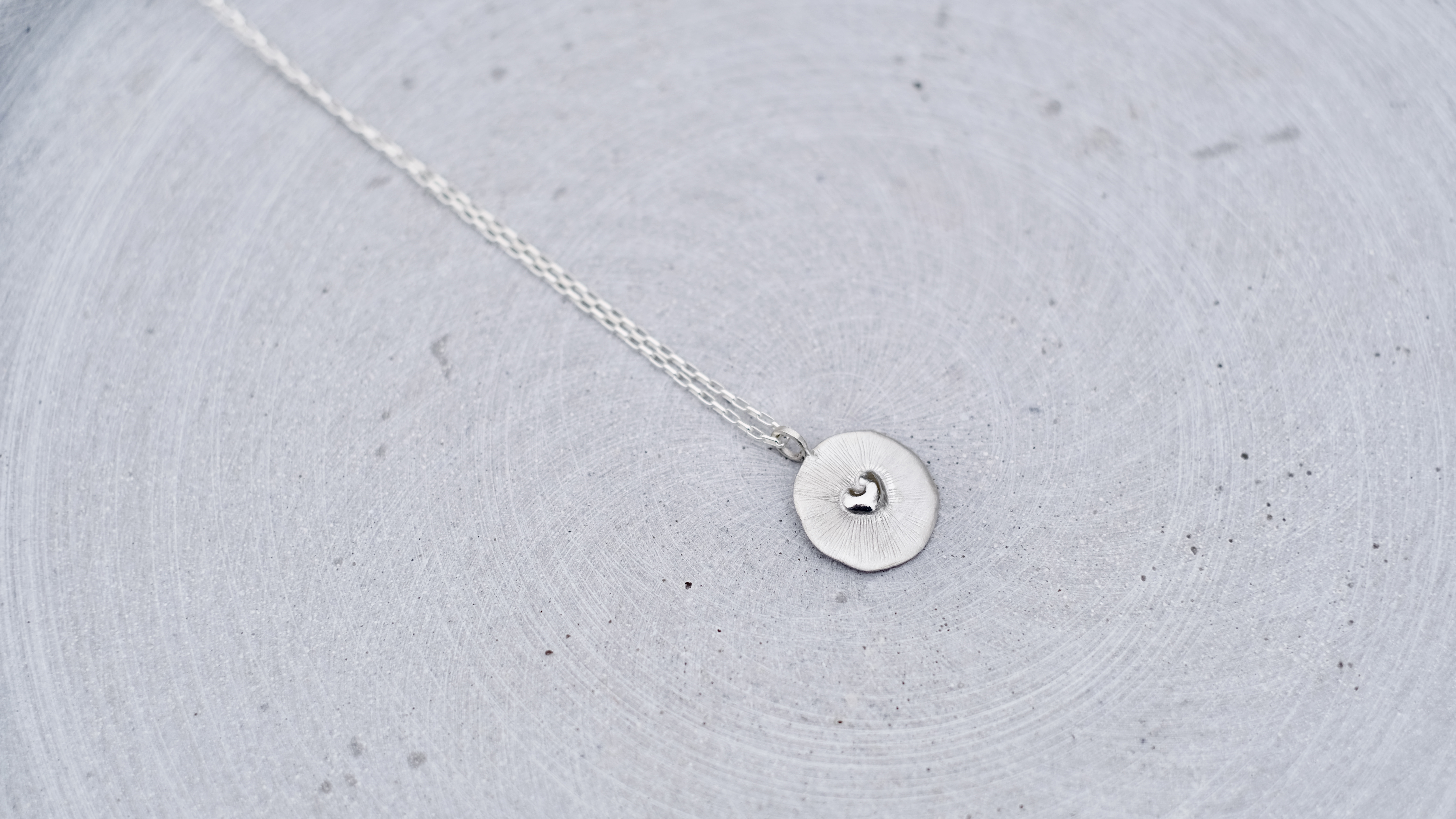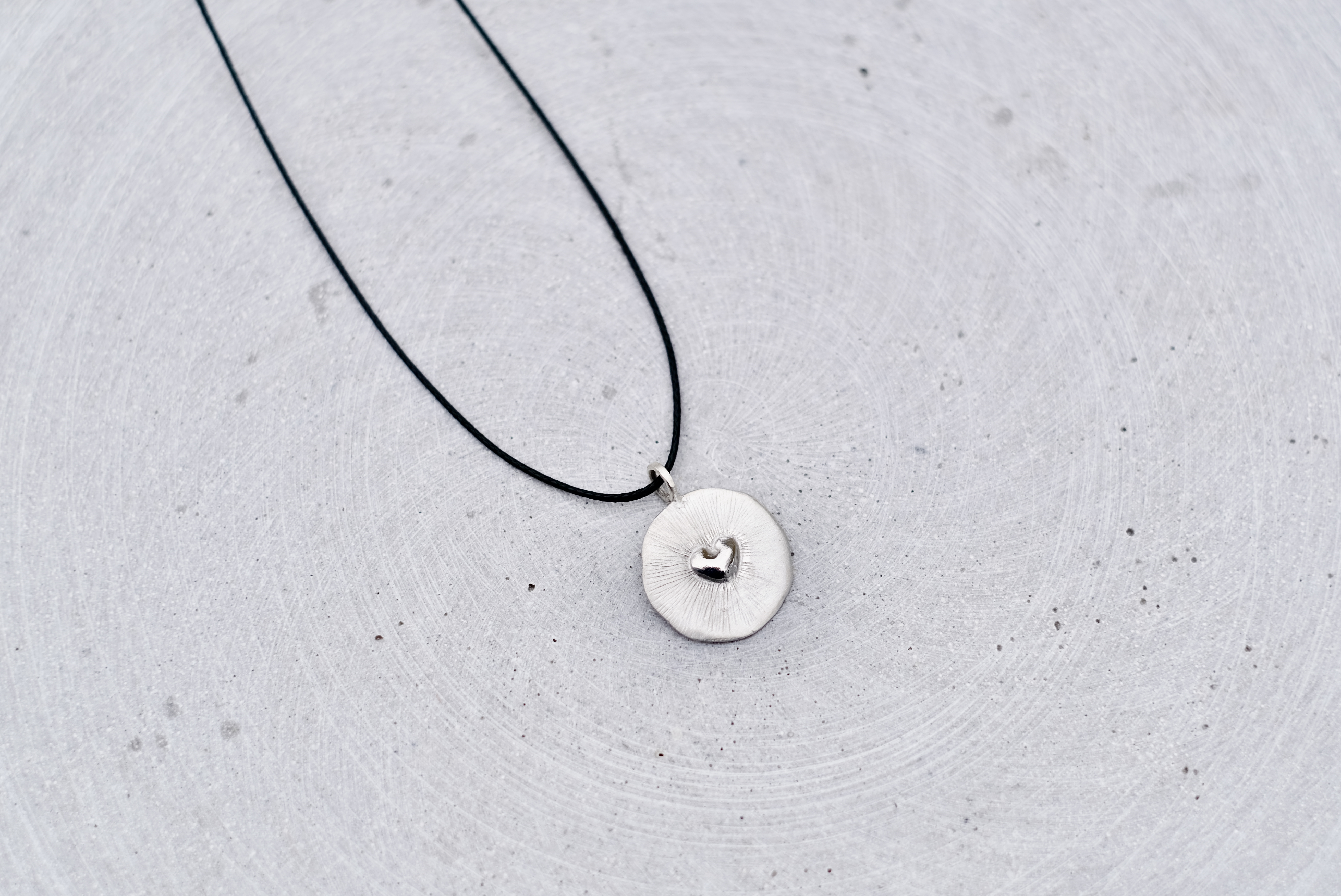 Rankų darbo sidabrinis medalionas su subtiliu, lyg nutirpusiu širdelės akcentu centre. Kiekvienas paviršiaus brūkšnelis nugulė natūraliai formuojant ir gludinant sidabrą, todėl nėra dviejų vienodų - tavo medalionas visiškai unikalus. Lengvas kasdieninis papuošalas tinkantis tiek dovanai tiek sau, kurio niekada nenorėsi nusiimti.