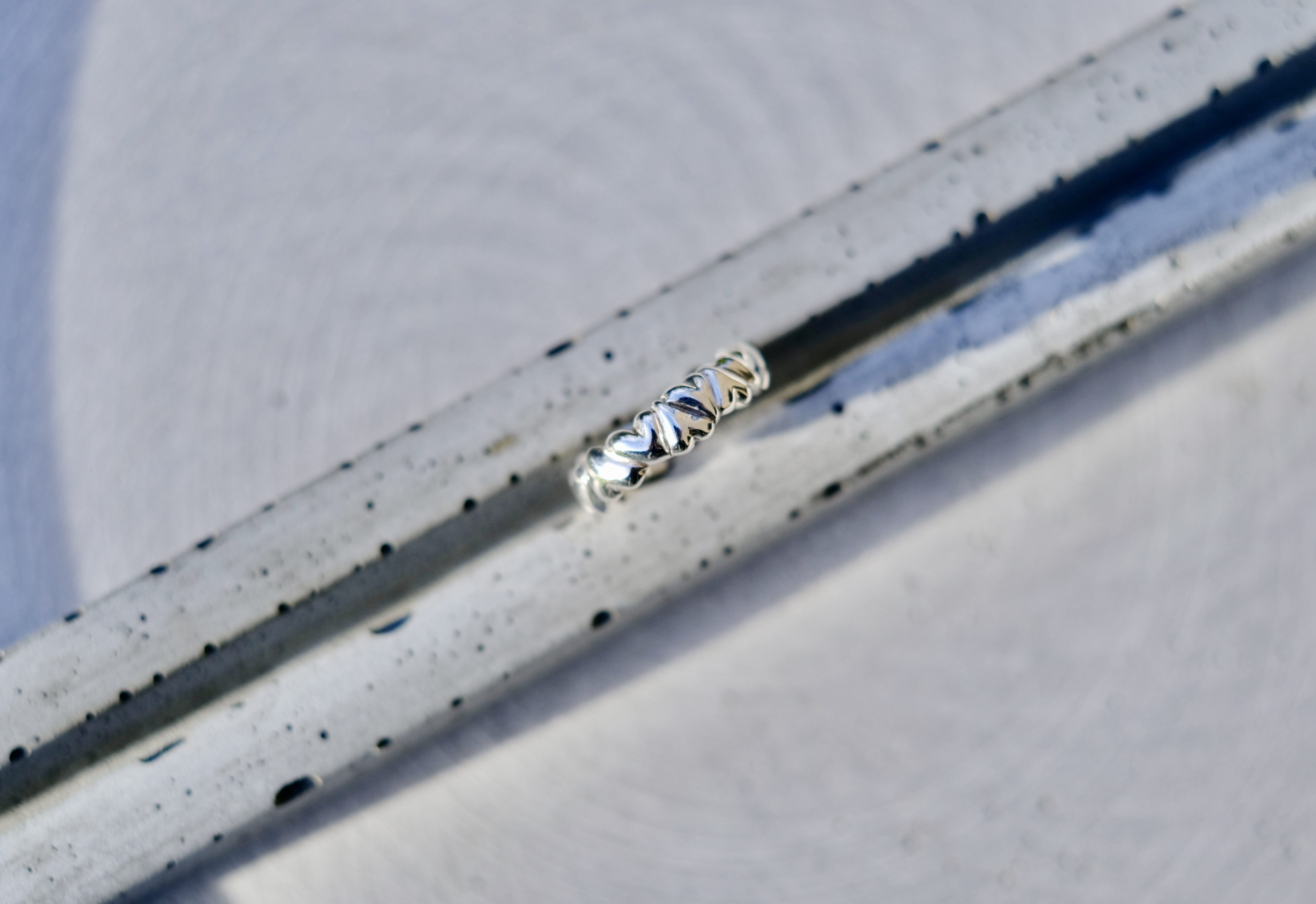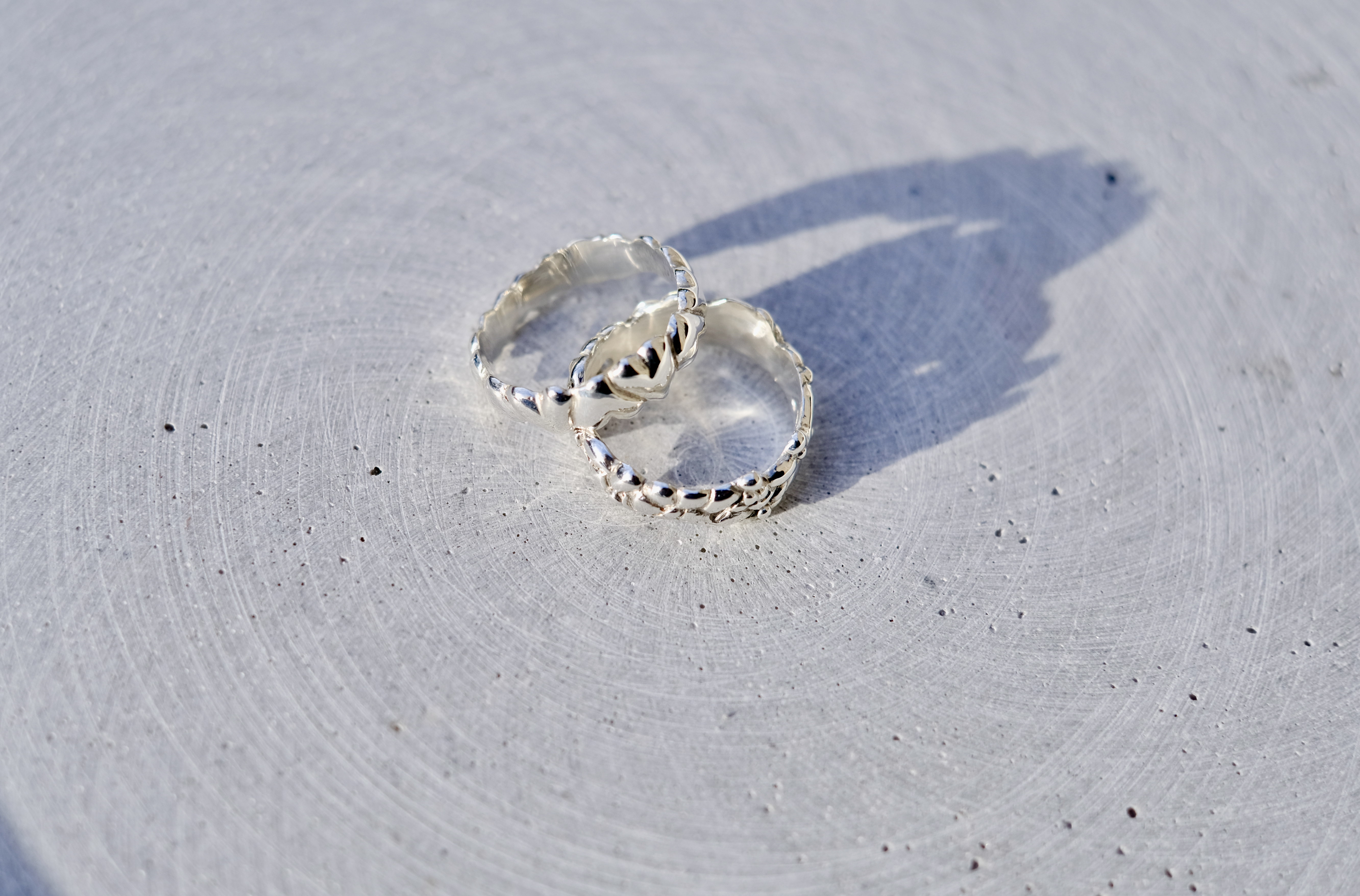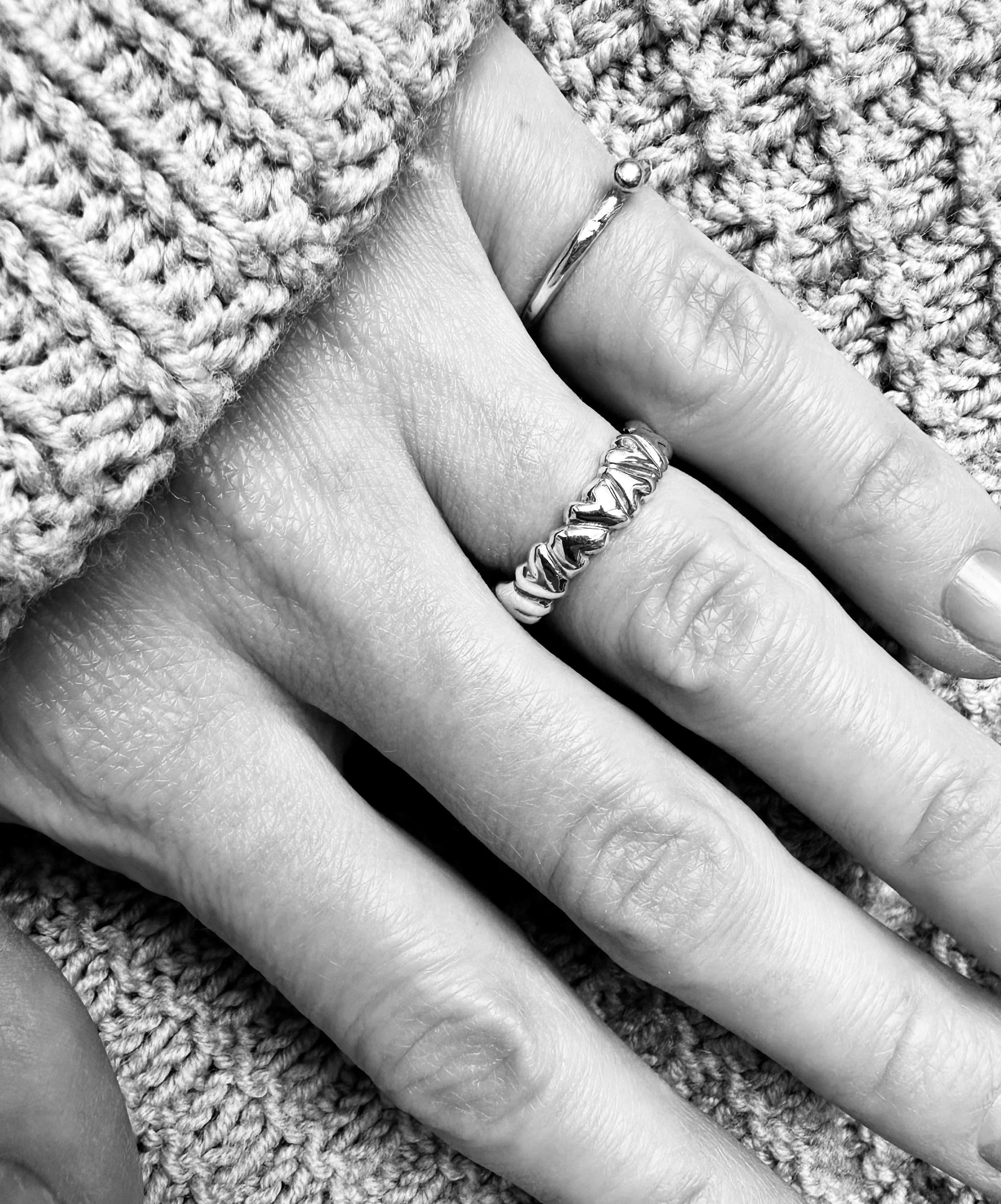 Rankų darbo žiedas kur širdelė gula prie širdelės, jos nėra tobulos - bet tikros. Žiedas sukurtas išlaikant organišką, švelnią nelygią rankų darbo faktūrą - kas daro jį ypatingu ir sukuria unikalų jausmą.
