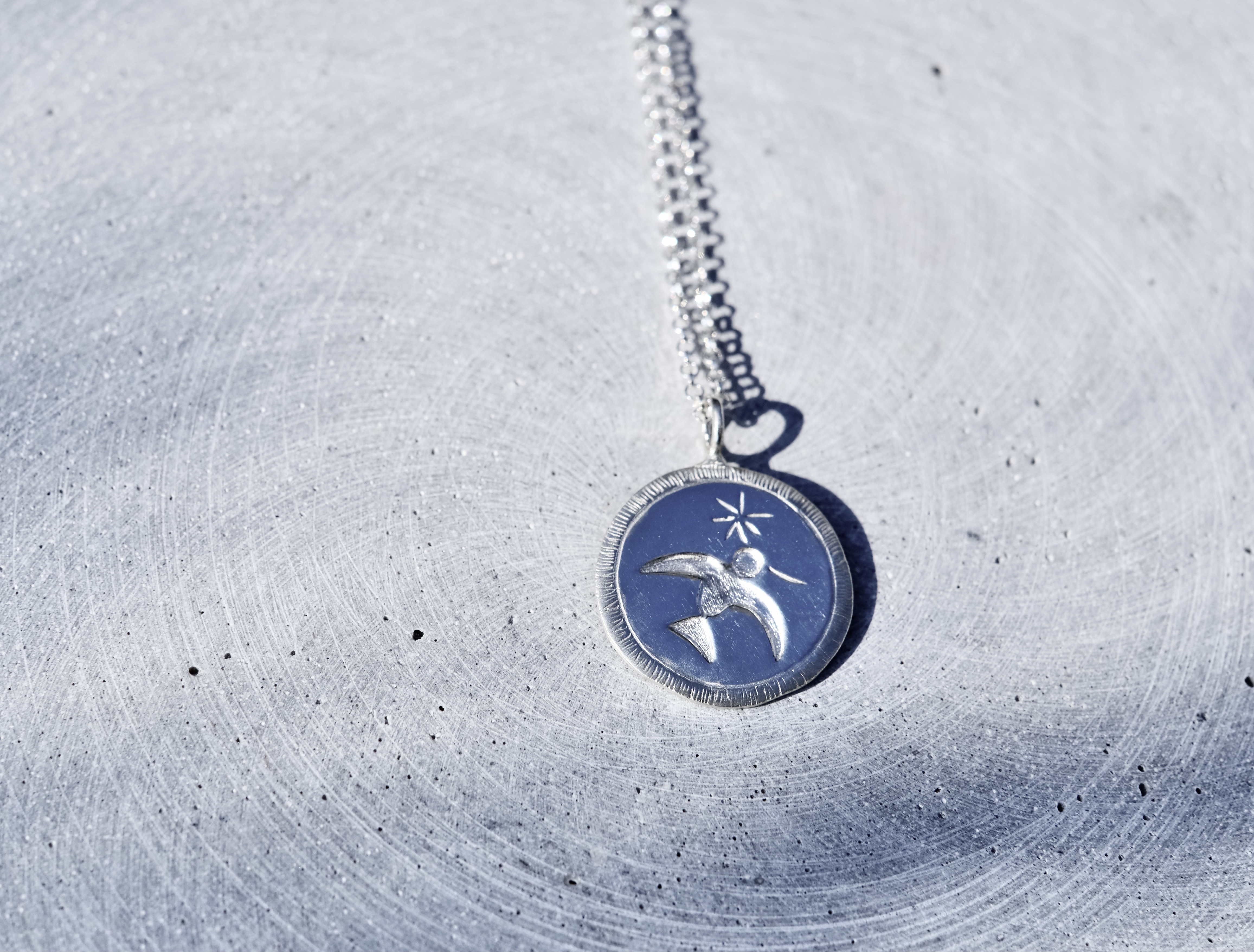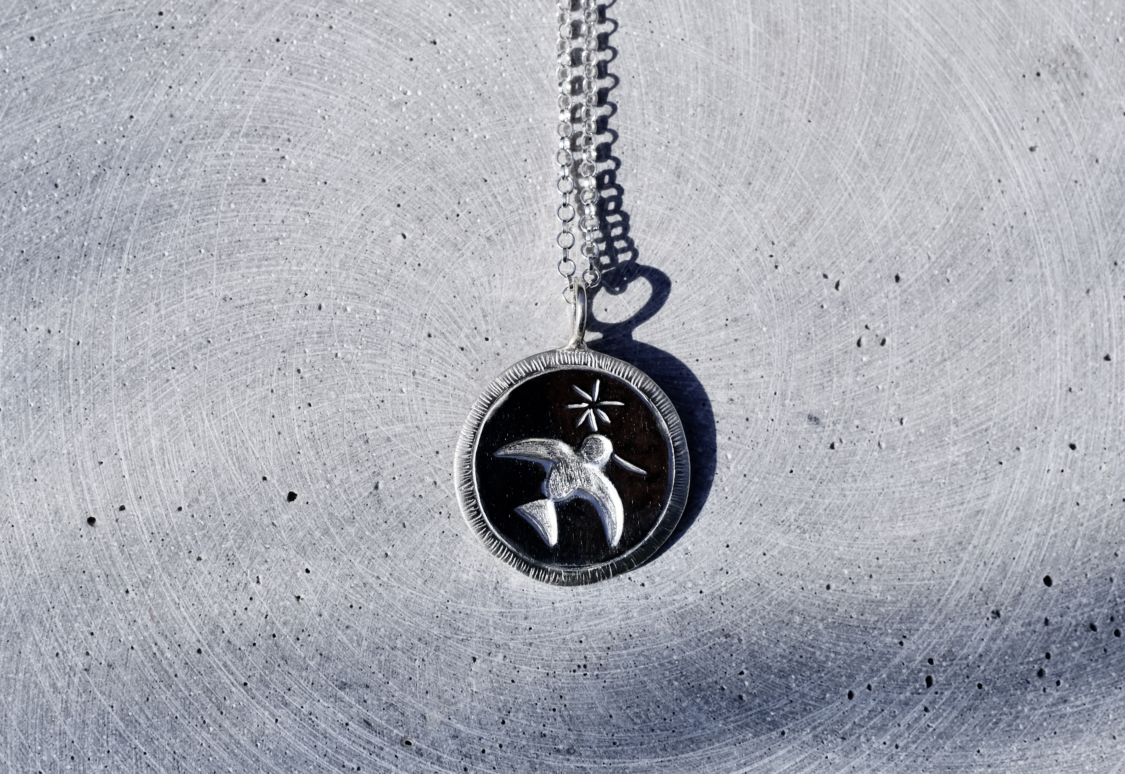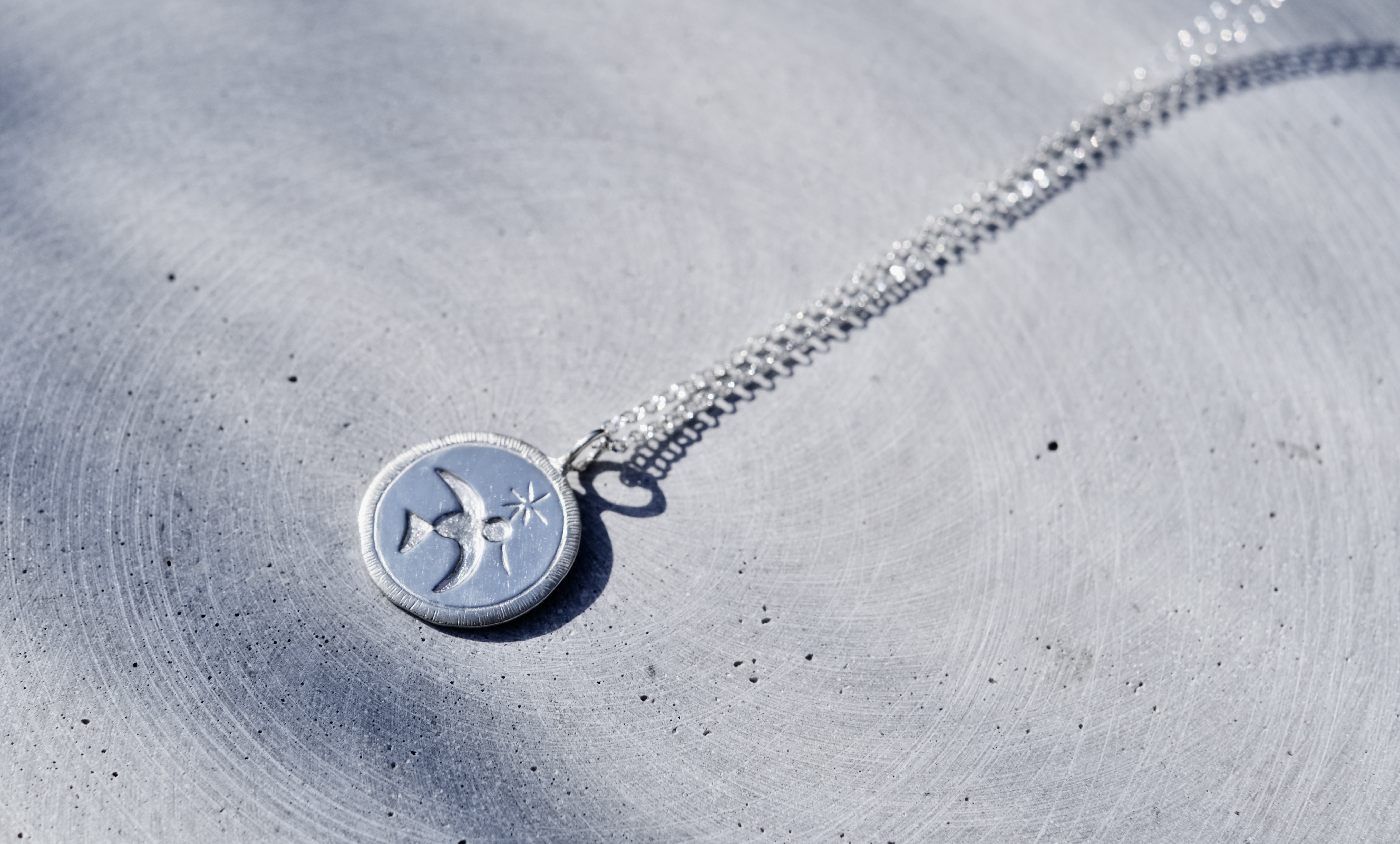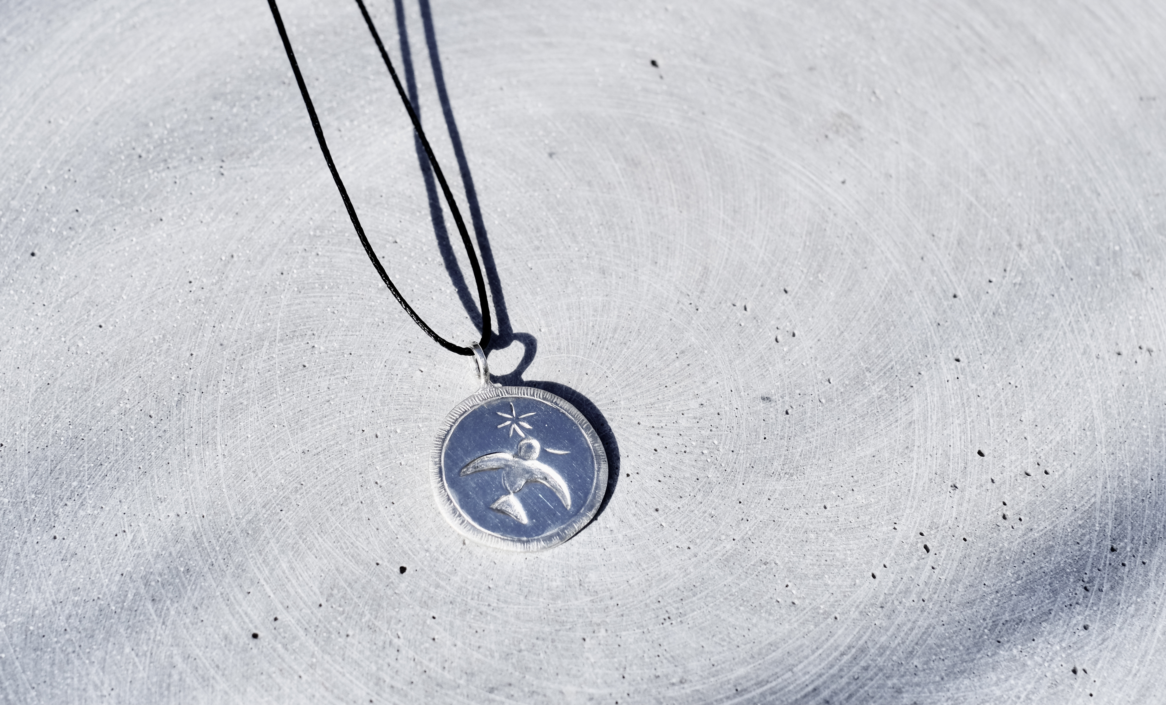 Rankų darbo sidabrinis medalionas su išraižytu paukčiu, kuris neša pienės pūką ar gėlės žiedą... Medalionas tai simbolinis papuošalas, kuris privalo turėti unikalią reikšmę jo savininkui. Tai papuošalas, kuris taps tavo kadieninis draugas. Galbūt šis lengvai skrendantis paukštis turi reikšmę tau ar tavo artimam?
