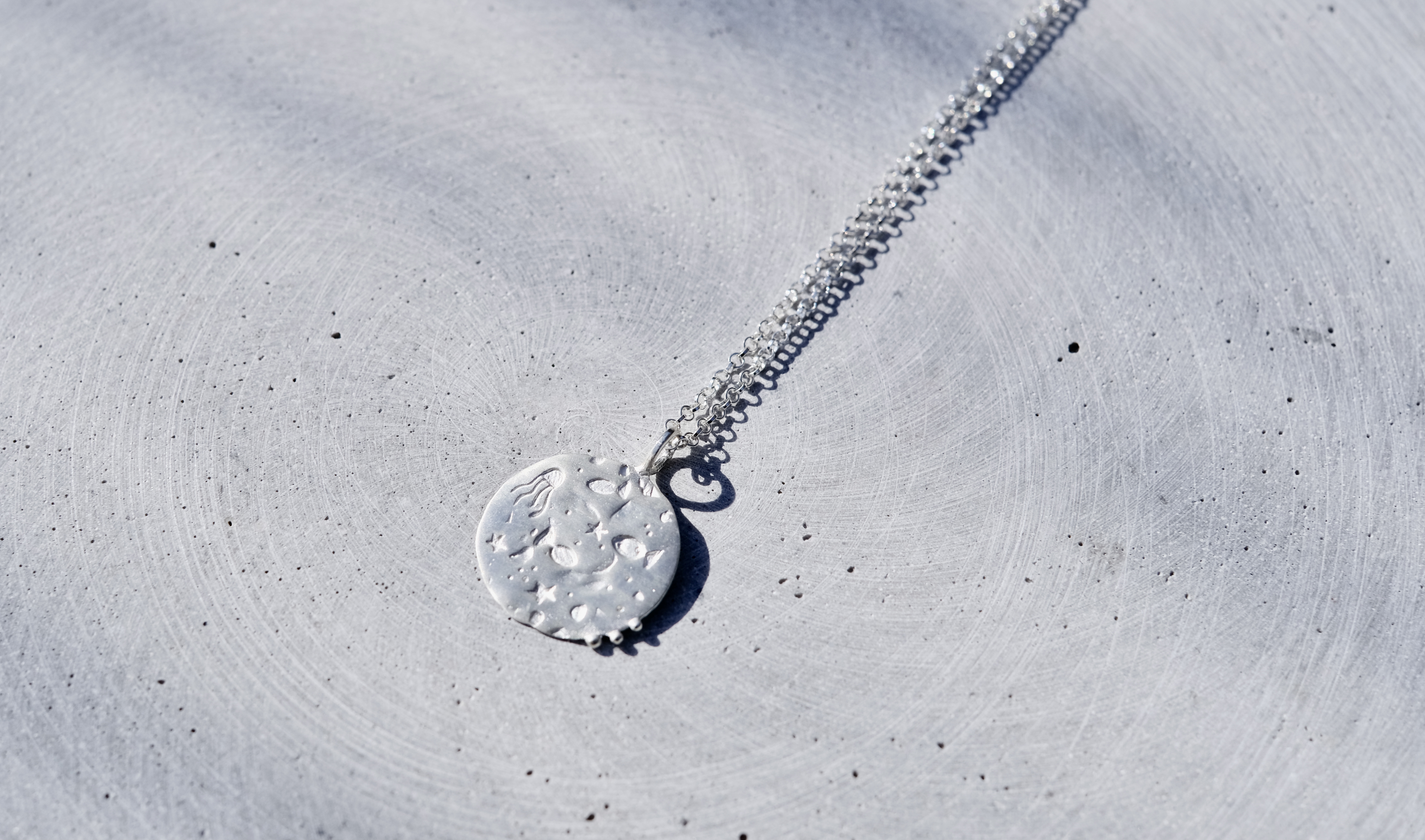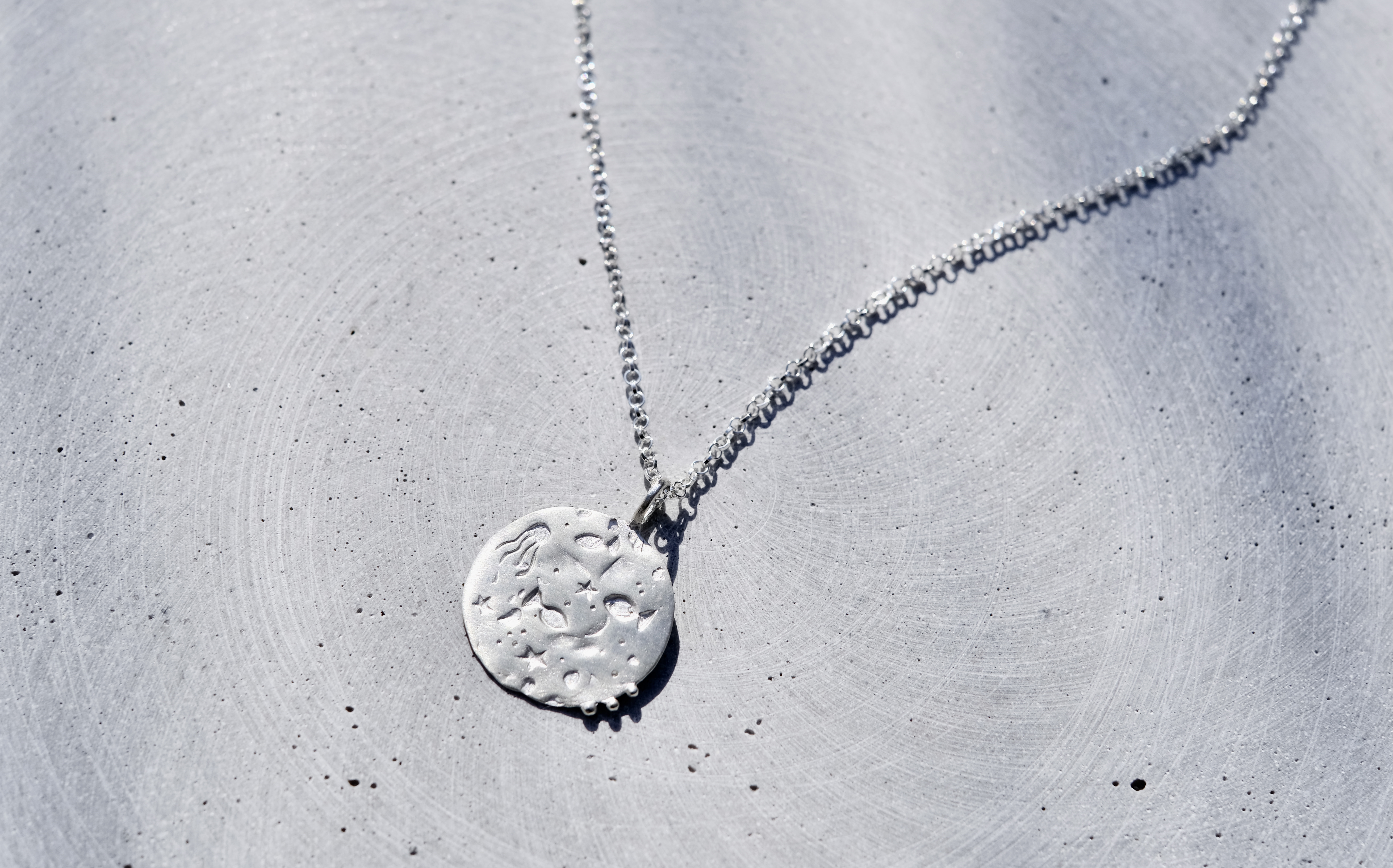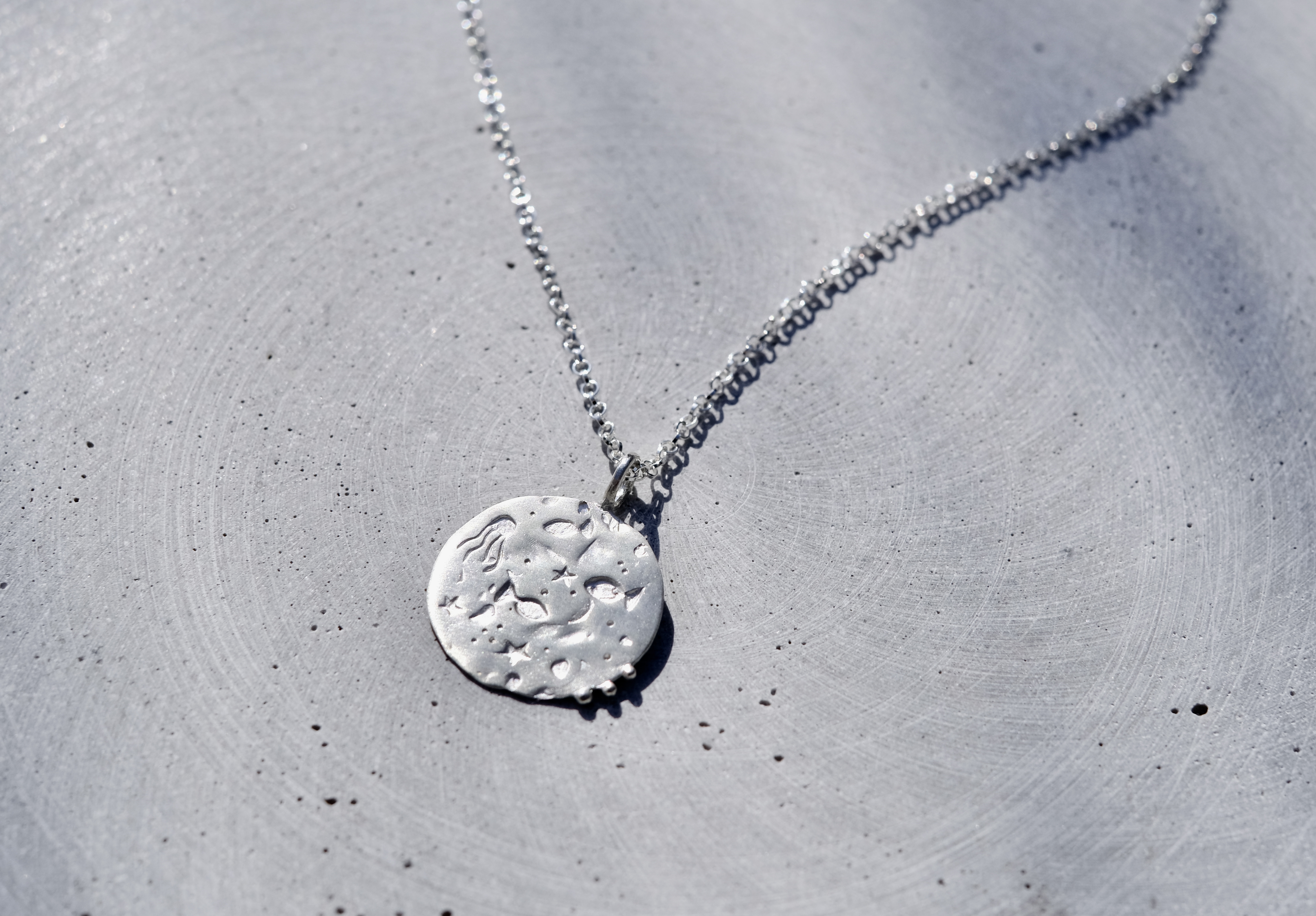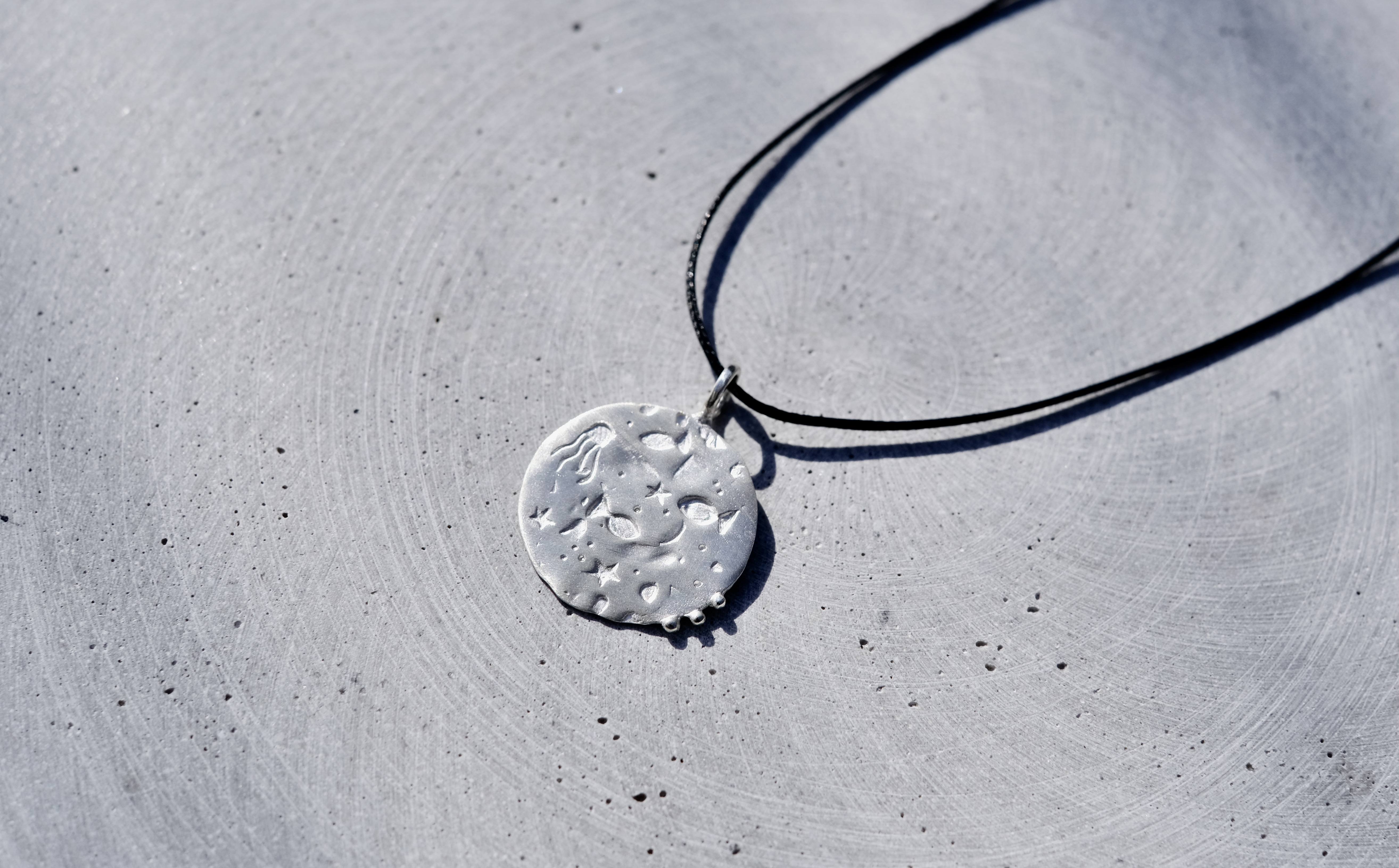 Unikalus, rankomis sukurtas sidabro medalionas - jūros gyvenimas. Žuvys, jūros žvaigždės, oro burbuliukai, aštunkojis, nelygus jūros dugno paviršius. Jis tikrai ypatingas, begalo malonus liesti ir atrasti jame vis naujus simbolius. Tai rankų darbo kūrinys, gimęs iš meilės jūrai ir tam jausmui, kurį ji sukuria. Kiekvienas jis - vienetinis.